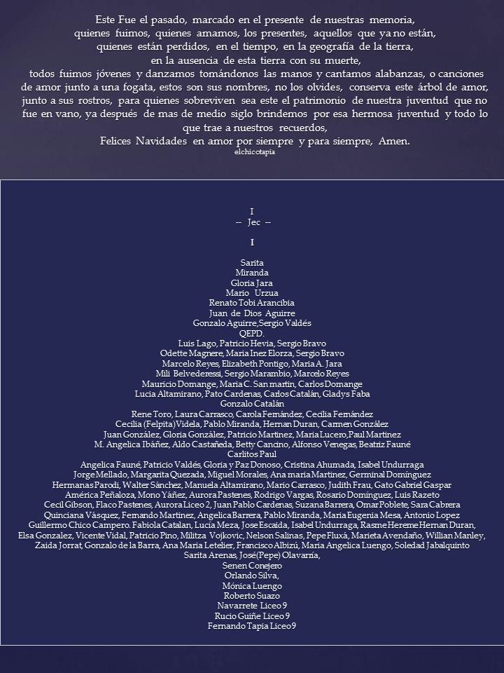 Si tu aun conservas el ideal de que Jesús fue un Cristo redentor celebremos su nacimiento con la gracia de una oración, que bendiga nuestro cariño de amor al prójimo y justicia en su nombre, lo mas importantes no son las ideas que nos separan, si no las ideas que nos unen y junto a estas los recuerdos de ……… Después de un medio siglo;