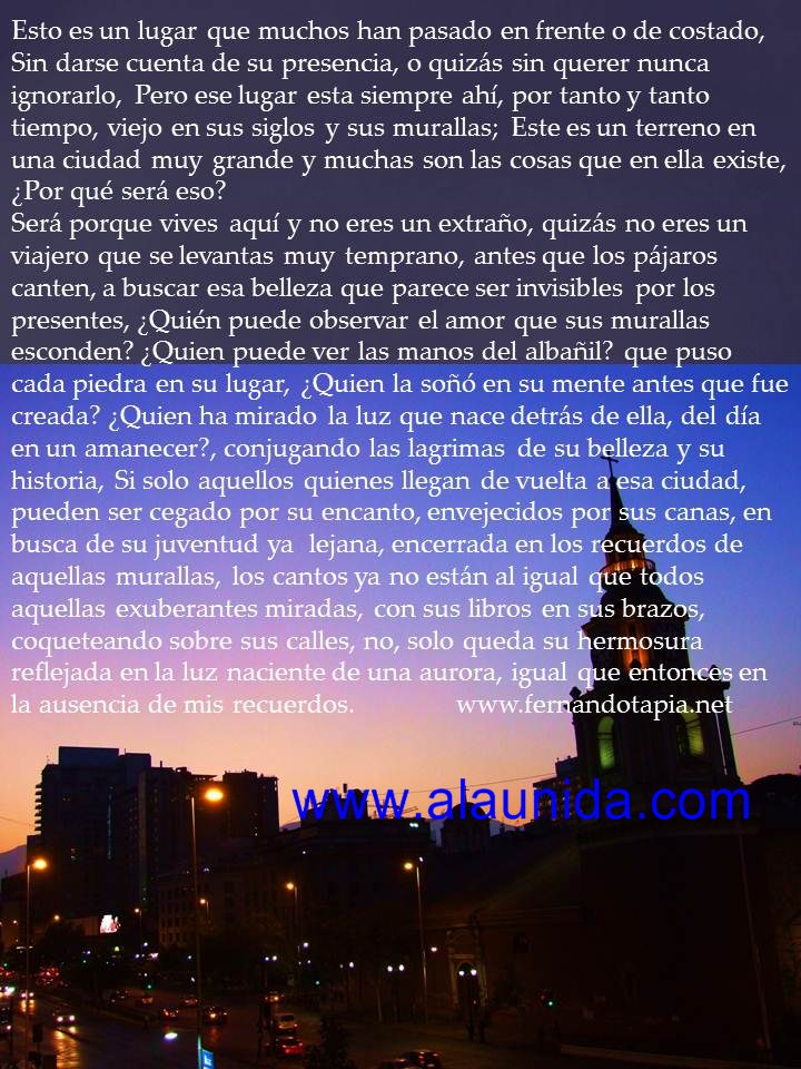 Caminar en aquellas calles nuevamente que nunca cambiaron en mi mente, que si han cambiado con el tiempo; esta es mi pintura la que intento trazar con mis palabras, pues nunca pinte, nunca tuve el don de los colores, de los dibujos o el alma de un artista; solo tuve mis ansias , mis sueños, y la pasión de amar aquello, todo lo que fue y que nunca dejara de ser en mi corazón, en mi mente , en mi espíritu, en mis recuerdos, pues mi mente nunca dejara de ser un niño, aquel que sintió, que creció y aprendió todo aquello que vosotros me enseñaste, familiares y amigos junto con aquellos los ausentes que nos dejaron, pero que nunca dejaran nuestros recuerdos, todos quienes son parte de esta vida que hoy vivo en consecuencia de vuestra existencia en mi.
